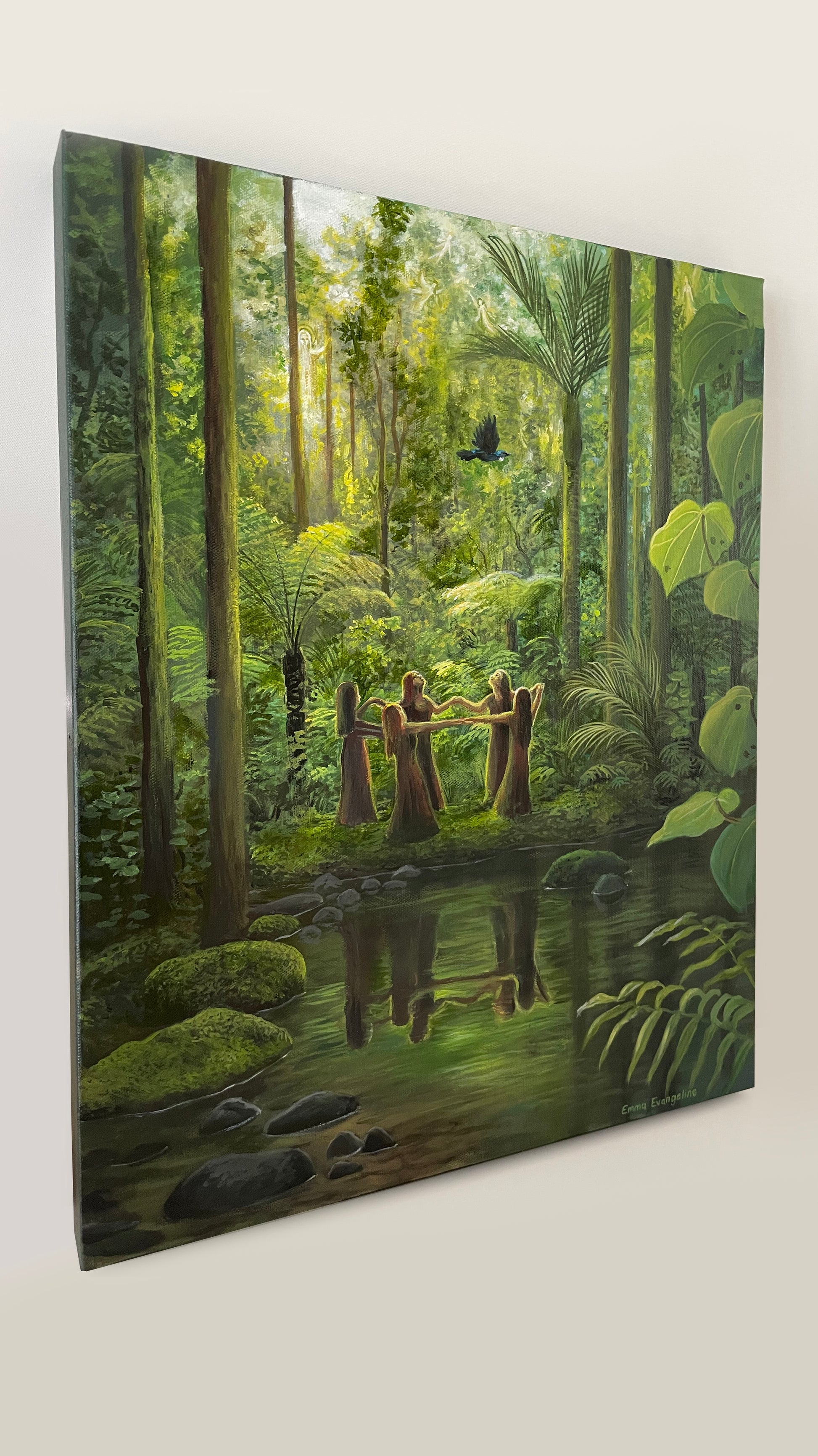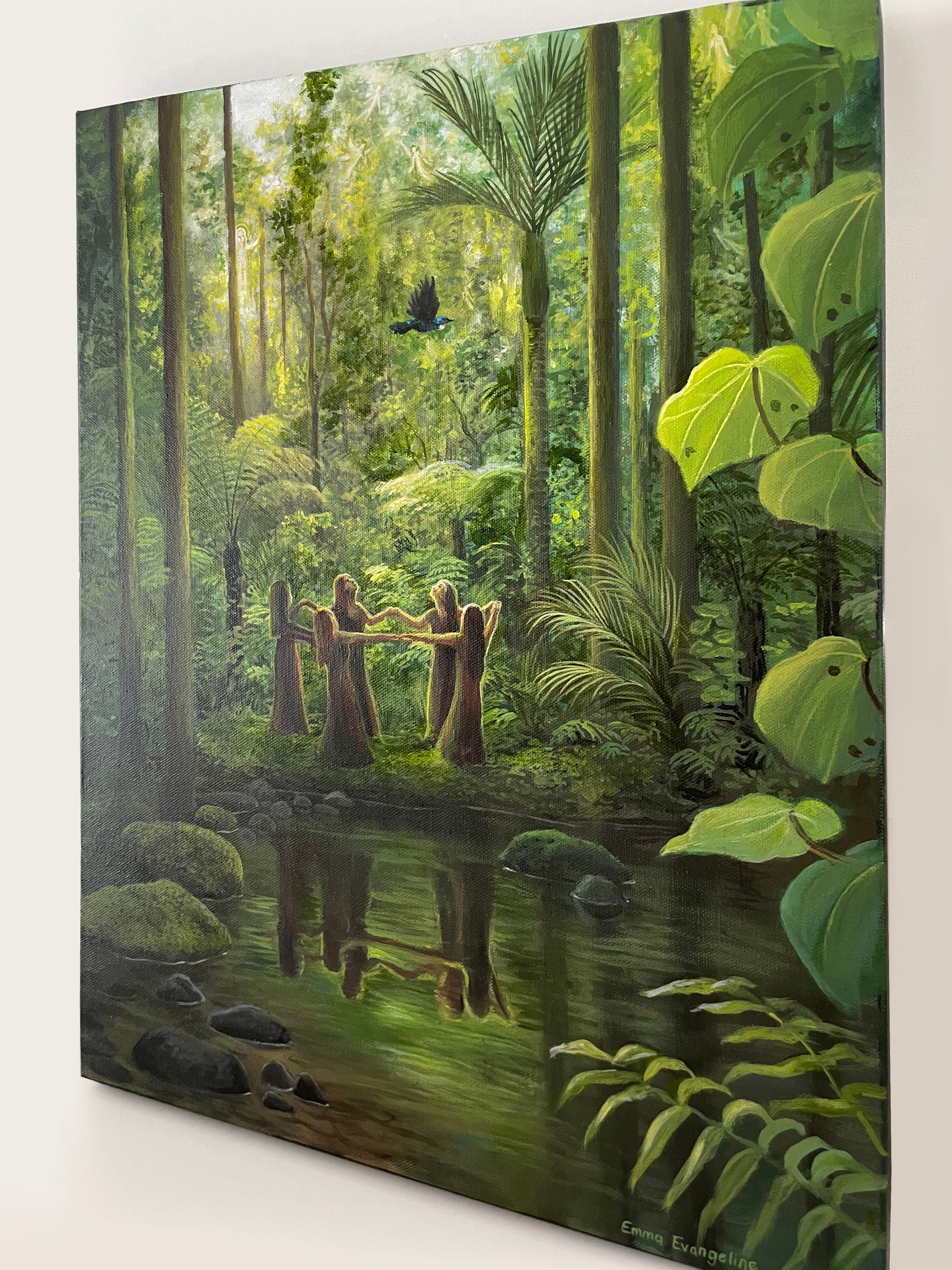 I love sharing the experience of being in awe of nature, and that was what I wanted to convey in this scene. This my latest women's circle scene with more of a focus on the surroundings as much as the figures. I loved adorning the light through the trees with little angelic figures and spirits, as if the ancestors and angels of the women are watching over them.