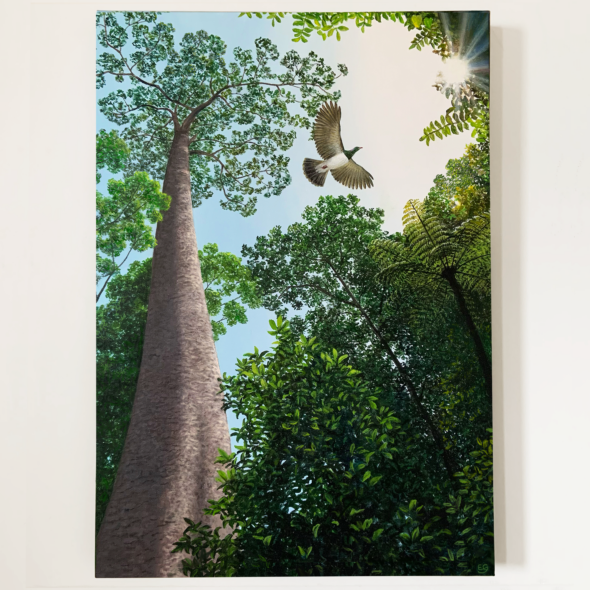 I love looking up into the trees when the sun is shining through, illuminating the treetops. I thought this scene would be the perfect fit for a kereru taking flight.